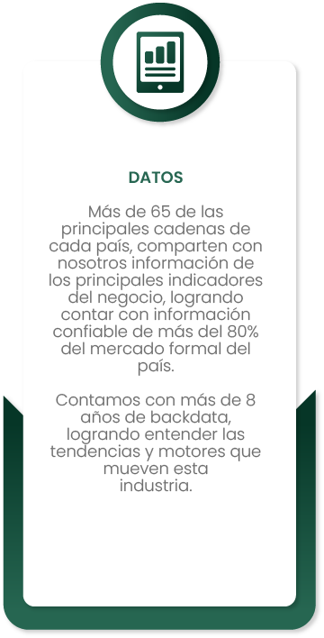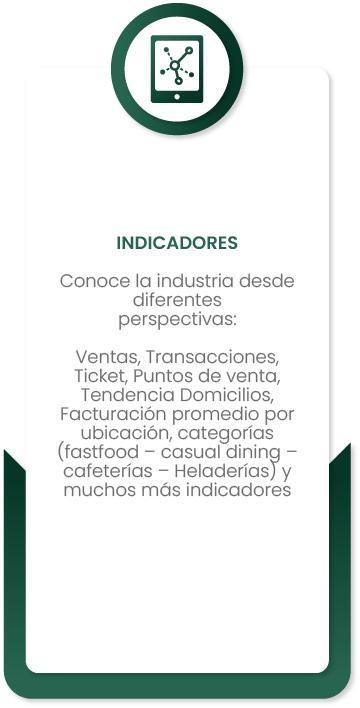 información real de la industria food service, tanto para operadores como para proveedores, cubriendo desde las tendencias en ventas, transacciones y ticket, hasta información relevante de las tendencias de arriendos, domicilios y datos georeferenciados para decisiones efectivas.